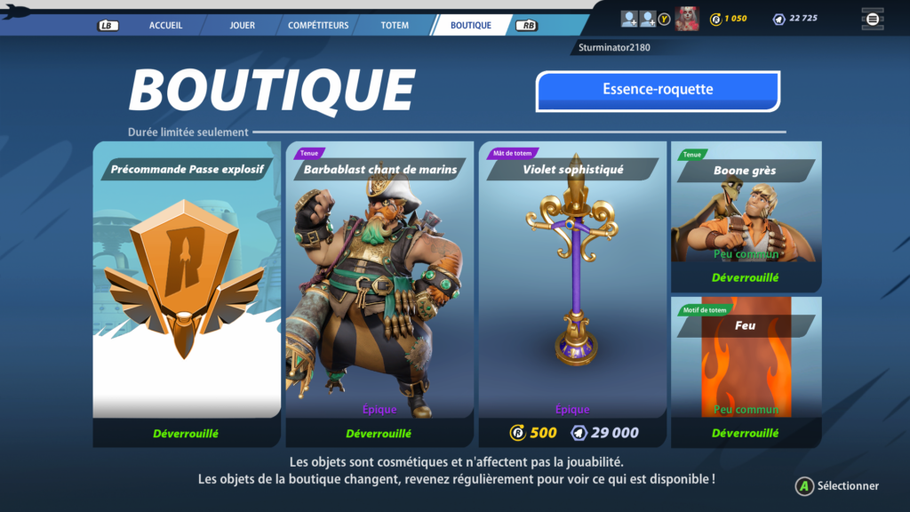 On va aborder un sujet qui va diviser et fâcher beaucoup de joueurs, le format économique du jeu. OUI LE JEU EST PAYANT !!! et j’avoue j’ai fait diviser au premiers abords. Le jeu est actuellement à 30€ sur toute les plateformes, mais une bonne nouvelle, le crossplay est direct actif sur le titre et on peut activer et désactiver quand on le veut. Et surtout je vais le comparer à un titre plus récemment sortie, Bleeding Edge. BE à sa sortie c’était un peu la misère niveau contenu … Ici 10 personnages, avec 100 niveaux chacun (où il y aura possibilité de gagner des pièces in game, des tenus et autres petits éléments cosmétiques…) 4 modes de jeu, une promesse de PVE, des saisons tous les trois mois avec au minimum un personnage (dont le prochain sera Flux) des nouvelles cartes, des événements. Un système de Battle Pass sera intégré, moyennant 10€ (950 Essences roquettes) où seulement des boosts d’expériences et toutes formes de cosmétiques seront dedans et n’entacherons en rien le gameplay du titre avec si on le complète d’obtenir 1500 Essences roquettes et pouvoir racheter les prochains pass sans surcoût je suis pour. Et je préfère débourser 30€ sur un jeu au contenu gratuit et aider les petits développeurs que de payer un Triple A 70€ et devoir encore raquer derrière et surtout quand ça impact le gameplay pour certains (coucou COD).