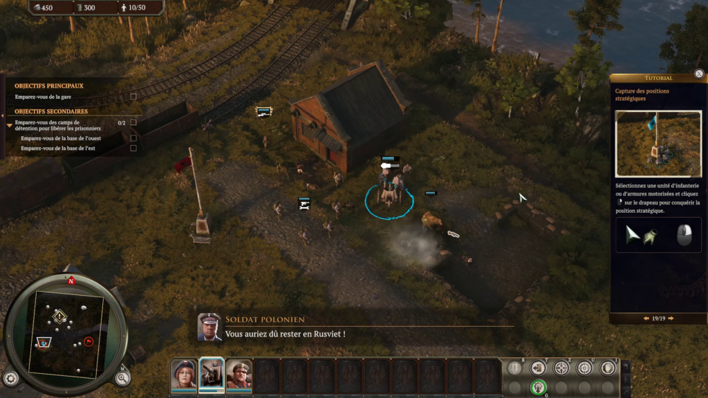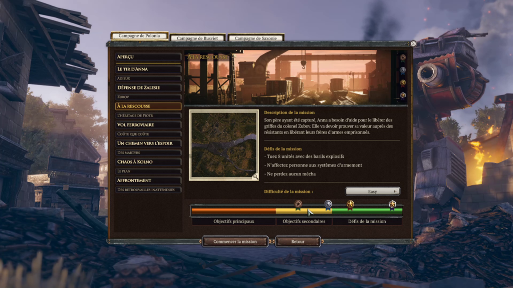 Dans tous les cas, si vous ne connaissez pas le genre n’ayez pas peur. Même si le jeu permet d’accéder à tous les modes en ligne ou multijoueur dès le début, la campagne solo est très bien travaillée. Ce n’est pas juste une campagne en mode « il y a des méchants, il faut les écraser ». Il y a une histoire qui se construit de mission en mission avec des personnages ayant vraiment une personnalité propre qui fait qu’on accroche. Nos protagonistes devront donc réussir toutes sortes de missions dans les territoires des trois nations. On retrouve donc la république de Polania, le tsarat Rusviet et l’empire de Saxonie parmi les factions que l’on pourra jouer et qui auront des unités propres.