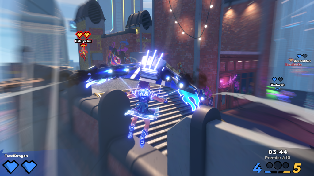 Je parlais un peu plus haut des ballons spéciaux, qui sont au nombre de 5 actuellement avec chacun leur petit bonus, une balle lunaire pour sauter plus haut, une bombe que vous pouvez coller au mur ou sur les joueurs et faire des dégâts de zone (attention cela touche vos alliés aussi), une balle cage pour enfermer les ennemis et les jeter sur leurs alliés ou dans le vide , une balle sniper et la multiballe. Une dernière balle existe, il s’agit de tout simplement vous, vous pouvez vous transformer en ballon bien sur à vous risque et péril. Si vous arrivez à toucher un joueur directement avec une balle humaine, vous enlevez automatiquement tous ses cœurs. Il est possible de charger entièrement le tir d’une balle joueur pour envoyer une sorte d’ulti, où le joueur sera envoyé en l’air et devra atterrir sur les ennemis pour provoquer une sorte de bombe (à la manière de la balle bombe), cependant il est très facile d’esquiver et le temps de réaction avant de pouvoir reprendre le contrôle peut vous couter cher !! Enfin vous pouvez être contré ou ramassé par l’ennemi et ce sera même sentence si on vous utilise en balle contre vos propres alliés. Mais vous pouvez tout de même vous échapper en martelant la touche action.