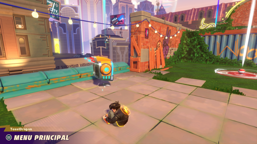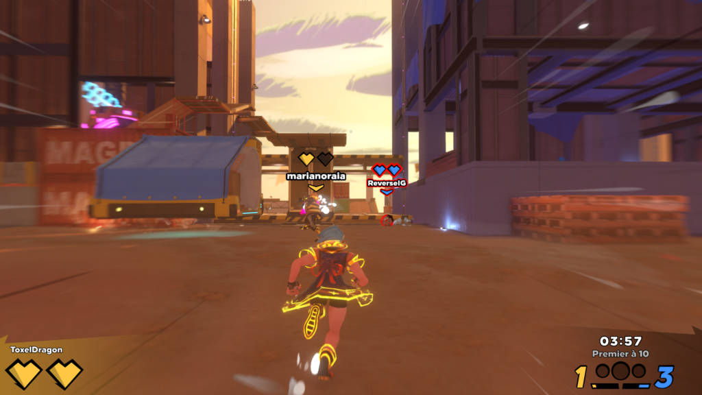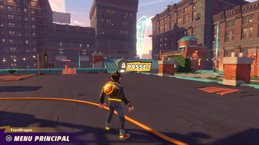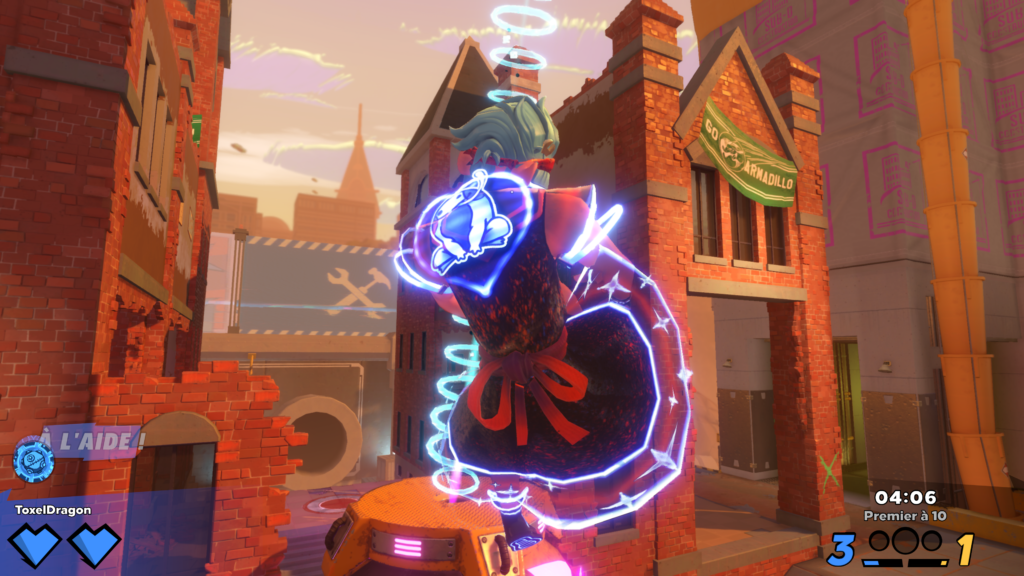 C’est parti avec un entrainement en guise de tutoriel et ma foi, il est bien fichu. Des petits robots TV sont la pour vous apprendre les bases du jeux réparties en 5 entrainements distincts : les fondamentaux, comment devenir le ballon, la surcharge des tirs et des passes, les différents coups spéciaux et les esquives, vous connaitrez tout ce qui faut savoir sur le jeu !! C’est parti vous sautez dans le grand bain pour enlever les deux points de vie qu’a chaque joueur pour marquer un point. Au lancement le jeu se dote de 5 maps toutes différentes et ayant chacune leurs spécificités, une boule de démolition, un pont reliant deux toits, un rond-point etc…