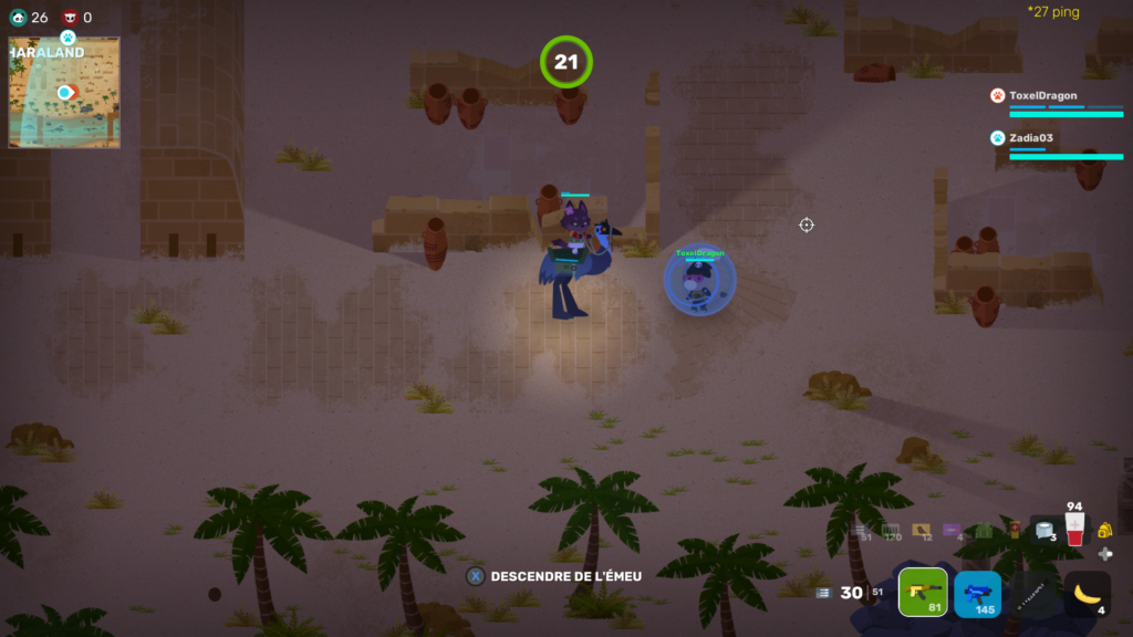 - Des émeus, qui servent de montures et permettent de se défendre des ennemis à coup de bec. Bien sûr leurs nombres de PV est limité et ils meurent s’ils se prennent trop de dégâts.