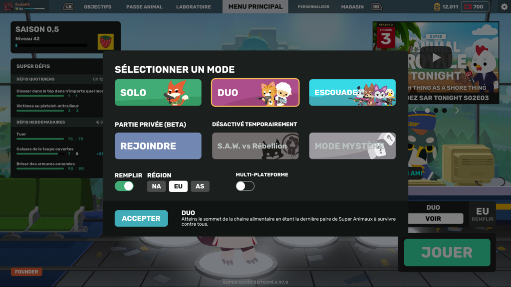Dans ce BR, nous incarnons un petit animal luttant pour sa survie à travers divers modes de jeux. Actuellement 3 modes permanents sont disponibles : un mode Solo, Duo et en Escouade (4 joueurs). Il dispose également de 2 modes de jeux temporaires, un mode mystère jouable en escouade (4 joueurs) et le S.A.W vs Rébellion dont nous n’avons pas encore pu tester le mode de jeu (désactivé temporairement). Lors de la sélection du mode de jeu, il est possible de remplir ou non l’escouade et de choisir le serveur du jeu parmi les 3 proposés. Il est également faisable d’activer ou non le mode multi-plateforme (A l’heure actuelle il est possible de jouer uniquement avec des joueurs de sa plate-forme et il est donc impossible de jouer avec ces amis s’ils sont sur une autre plate-forme de jeux). La cross-progression est présente et permet donc au joueur de récupérer ces accessoires mais pas encore les billets rouges S.A.W (la monnaie payante du jeu).