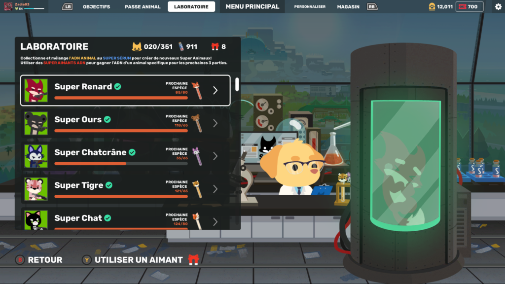 Le laboratoire permet aux joueurs de débloquer les différentes espèces animales, ainsi que les skins grâce aux ADN et aux échantillons. L’ADN et les échantillons sont donnés à la fin de chaque game aux joueurs. La quantité d’ADN et d’échantillons reçus dépendra du classement du joueur dans le battle royale et du nombre de joueurs présents initialement dans la game (une game d’IA rapportera moins d’ADN et d’échantillon qu’une game full de joueurs).