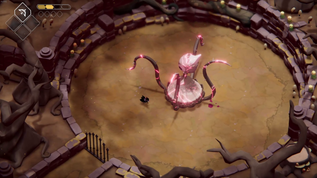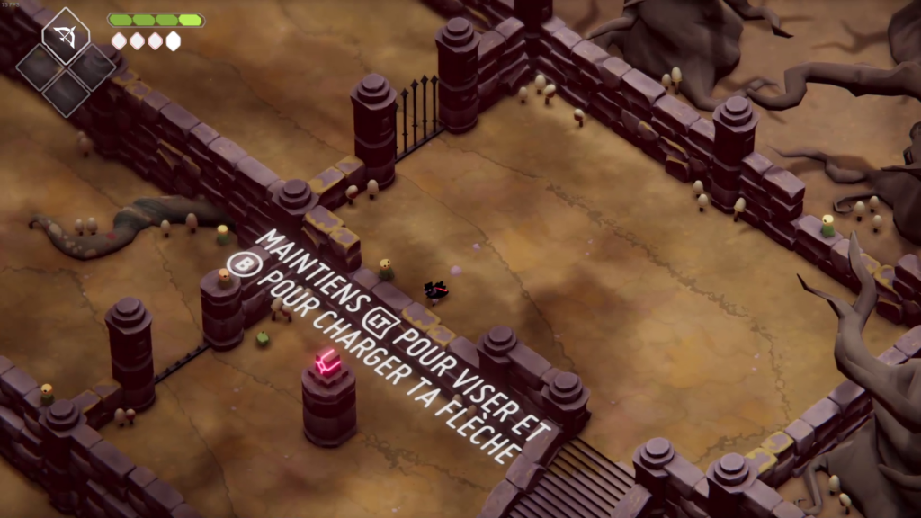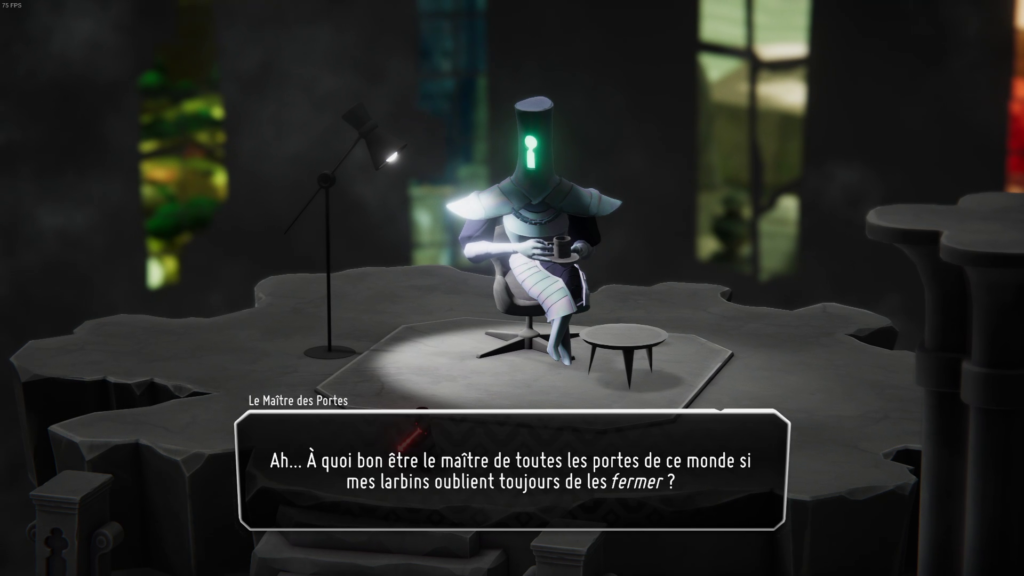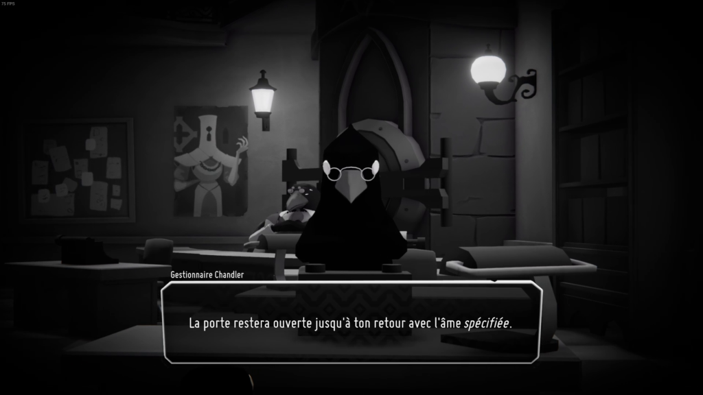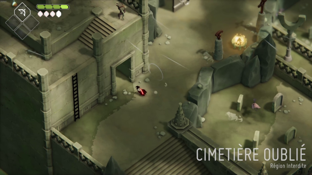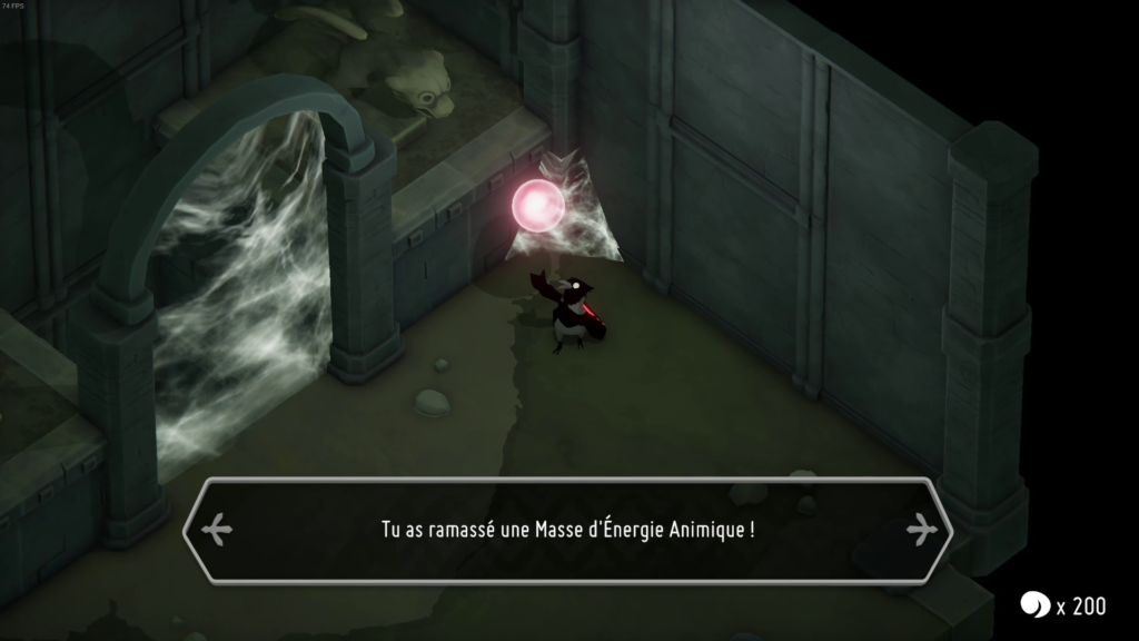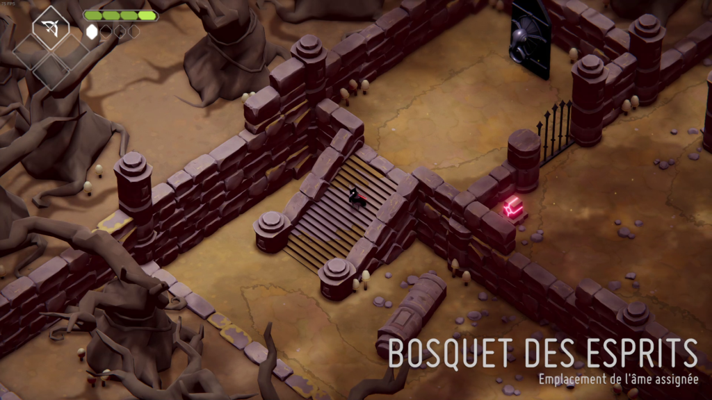 Avec Death’s Door, on retrouve de l’exploration, des énigmes, des combats et des boss épiques! La recette d’un bon RPG avec plein d’aventures pour notre petit piaf noir. Vous l’aurez compris, c’est un corvidé que l’on incarne. Mais pas n’importe lequel, vous êtes un faucheur! un employé qui doit ramener des âmes qui ont atteint leurs dates limites et qui servent à ouvrir des portes vers d’autres âmes et ainsi de suite. Le tout est chapeauté par le maître des portes actuel et géré par d’autres corbeaux administratifs. On vous l’explique dès le début, vous devez aller faucher une âme géante, mais le passage de la porte vous rendra mortel et seul l’acquisition de cette âme cible vous rendra l’immortalité. Armé de votre courage, votre épée et votre arc vous abattez cette âme mais avant de la récupérer un être géant vous assomme.