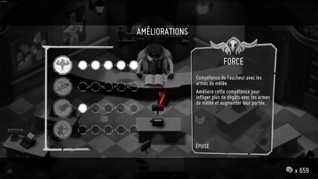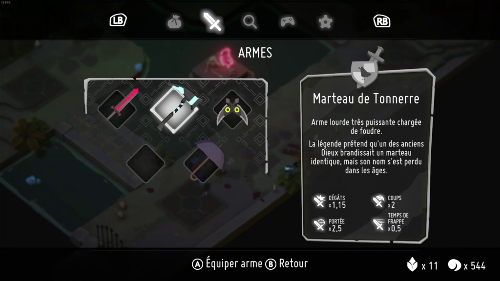 Durant vos aventures, vous croiserez aussi de nouvelles armes en plus de votre épée. Parmi les premières vous aurez des lames rapides et un marteau par exemple. Chaque arme a un nombre de combo, une portée, des dégâts et une vitesse de frappe différente. Par exemple le marteau tape deux fois d’affilée mais fort alors que les lames rapides frappent jusqu’à 6 fois rapidement mais font peu de dégâts. Chaque arme propose également une attaque chargée différente pour chacune d’entre elles. Pour compléter le côté RPG on a une gestion des « caractéristiques » également. Au bureau, on vous proposera de dépenser votre puissance animique pour vous améliorer. Vous pourrez améliorer vos dégâts, vitesse de frappe, vitesse d’esquive et déplacement ou encore les sorts et projectiles.