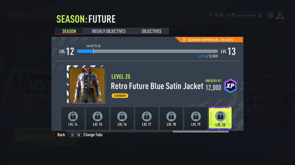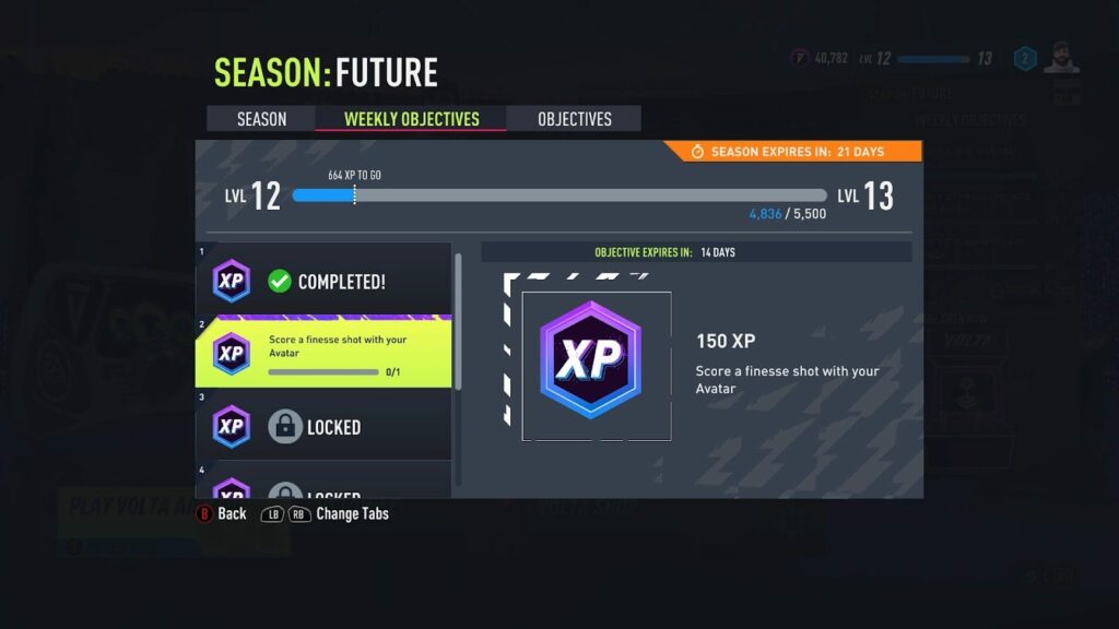 Lors de chaque saison, vous aurez la possibilité de débloquer du nouveau contenu en jouant régulièrement à VOLTA FOOTBALL. En disputant des matchs et en remplissant vos Objectifs hebdomadaires, vous remporterez de l’EXP Saison qui vous permettra de progresser dans la saison et de débloquer du contenu saisonnier unique que vous ne pouvez obtenir que via les récompenses EXP.
