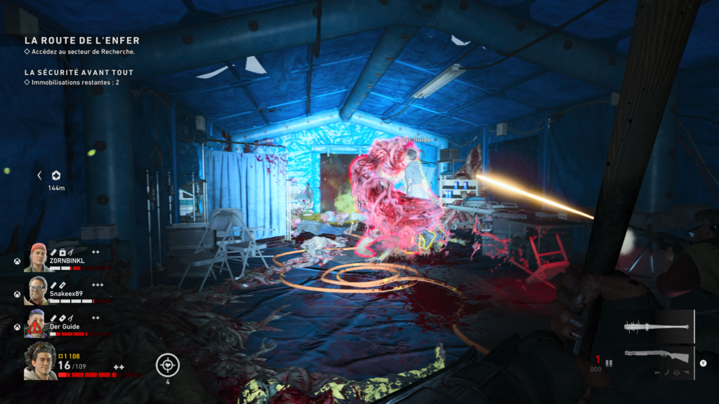 Il existe un certain mode Nuée qui est le mode PVEVP du titre (oui un seul mode) et qui nous rappel les bons souvenirs de L4D. Le mode consiste à affronter deux équipes de quatres, une de Nettoyeurs à une équipe de Zombies Spéciaux (oui je vais enfin parler d’eux). Le but est de résister/éliminer contre l’équipe adverse. Celui qui fait le meilleur chrono gagne une manche, à 2 c’est la Win. Vraiment on va pas se cacher le mode est pas foufou, on fait 2/3 games et on s’en lasse déjà dommage car avec plus de modes ou une meilleure approche cela aurait pu être un bon complément. Est ce que la peur de l’échec d’Evolve était là sans doute, car on sent tout de même un mauvais équilibrage….