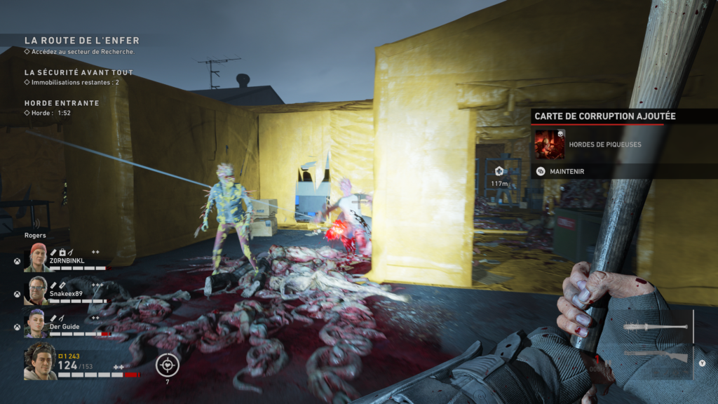 Le synopsis est tout simple, une épidémie touche le monde (non c’est pas le COVID mais plus comme la plante de Résurrection si tu as la référence) puisqu’un parasite (laisser sous entendre d’origine extraterrestre) transforme les gens en « Riders » ou comme on le dira plus facilement des zombies, assoiffé de chair et de sang. Mené par Mama, un groupe de vétéran nommé les « Nettoyeurs » sont la pour éradiquer et faire revenir la paix à Fort Hope. Le studio nous propose ici vraiment du fan service et ne sera pas là pour se réinventer mais améliorer l’expérience de jeu que tous attendaient depuis longtemps avec un Left 4 Dead 3 manquant à l’appel. Comme pour son « ancêtre », B4B nous propose de partir à 4 joueurs en coopération pour faire face à ces monstres. Pour y parvenir, nous allons traverser 4 Actes répartis en Chapitres et sous chapitres (pour un total d’une vingtaine de missions) qui je vous avoue restent pour certaines un peu courtes, mais aux objectifs variés. Même si le jeu nous fait commencer comme un bon L4D avec les appartements, le studio nous change vite d’atmosphère et nous gratifie de plusieurs environnements passant de la forêt, aux égouts. Mention spéciale comme on peut le lire partout (je ne fais pas dans l’originalité je sais) pour la mission du Jukebox, où il faudra le protéger pendant que les survivants s’échappe en bus sur du bon son !!