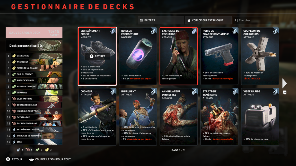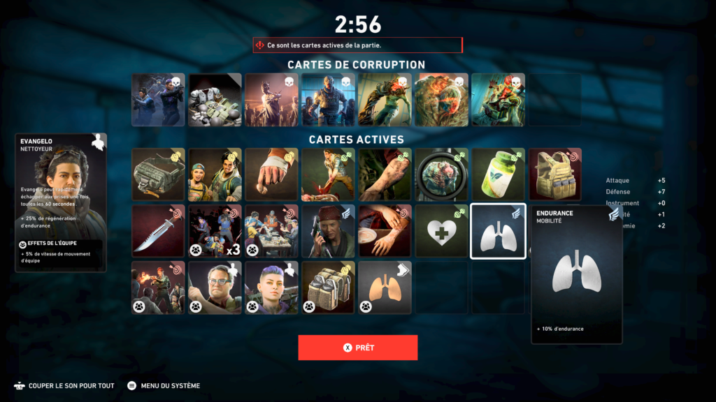 Même si c’est du L4D tout craché, B4B nous propose pas mal de nouveautés dont deux très intéressantes, la première étant les « Nettoyeurs ». Au nombre de 8, chacun apporte sa petite contribution personnelle avec un petit bonus pour soi même et pour l’équipe. Couplé à cela, vous avez la grosse nouveauté, le système de Deck. Cela peut paraître compliqué mais pas tant que ça, avant tout de début de partie, dans le HUB, vous pouvez confectionner votre petit jeu de cartes pour aborder les missions. Au total, 15 peuvent être choisies (parmi une centaine) et octroiera à vous et votre équipe un bonus correspondant à la carte. De base, un deck prédéfini est disponible pour nous lancer au début de notre périple, mais petit à petit nous gagnerons des points de ravitaillement qui permettrons de débloquer des cartes de plus en plus intéressantes. Si par hasard, vous arrivez à activer toutes vos cartes en avançant simplement dans les Actes (vous repartez de 0 à chaque changement d’acte), ne vous inquiétez pas, des cartes bonus seront ajoutées qui sont tout simplement celles de base (plus de vie, de munitions, de stamina, etc..). Cet ajout est non négligeable puisqu’il augmente considérablement la durée de vie et surtout peut nous aider à appréhendez les niveaux aux difficultés supérieures de meilleurs manière. Mais sur ça j’y reviendrais plus tard …