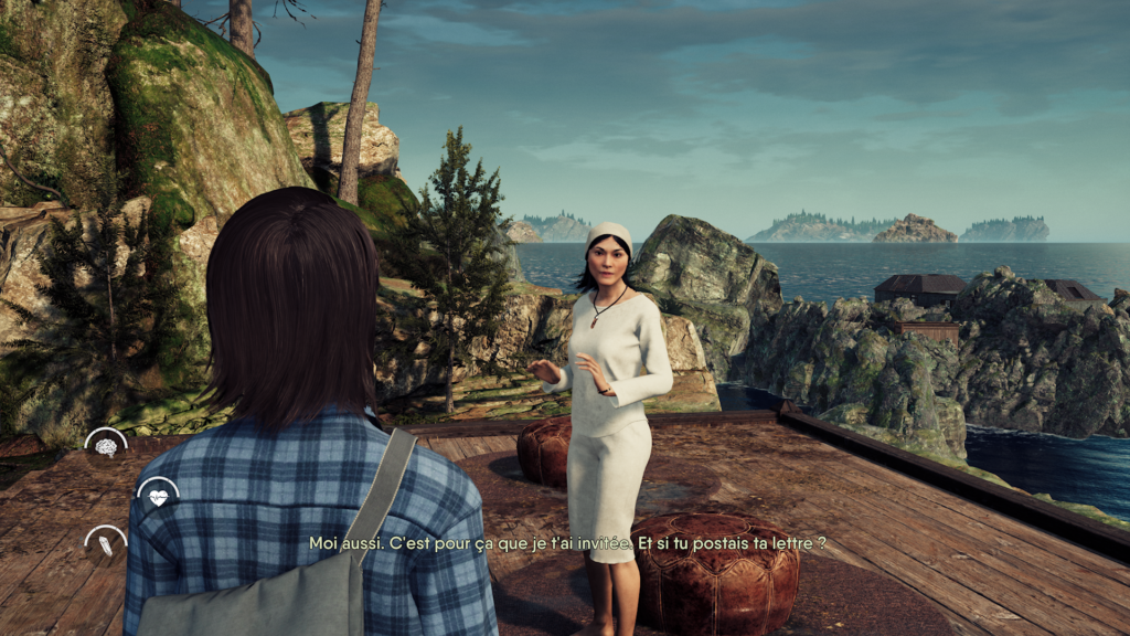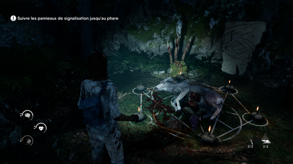 Pour en venir au gameplay de The Chant, au tout début de son arrivée sur l’île, Jess reçoit un prisme de couleur. Chacun des personnages en a un et lors de notre première escapade pour rattraper Kim, nous comprenons que ce cristal permet de traverser des zones accessibles seulement avec. Ces zones appelées, l’Obscurité, consommeront notre énergie mentale (signalée en bas à droite sous l’icone du cerveau) jusqu’à la crise de panique. Si la crise de panique est présente, attention vous nous pourrez plus attaquer et la mort sera sans doute la dernière issue. Mais ne vous inquiétez pas, cette barre (comme les deux autres) peuvent être remontée grâce à la prise de plantes spécifiques, ou pour le mental, d’un petit coup de méditation qui consommera la barre de spiritisme qui elle sert à envoyer des capacités liées à notre prisme.