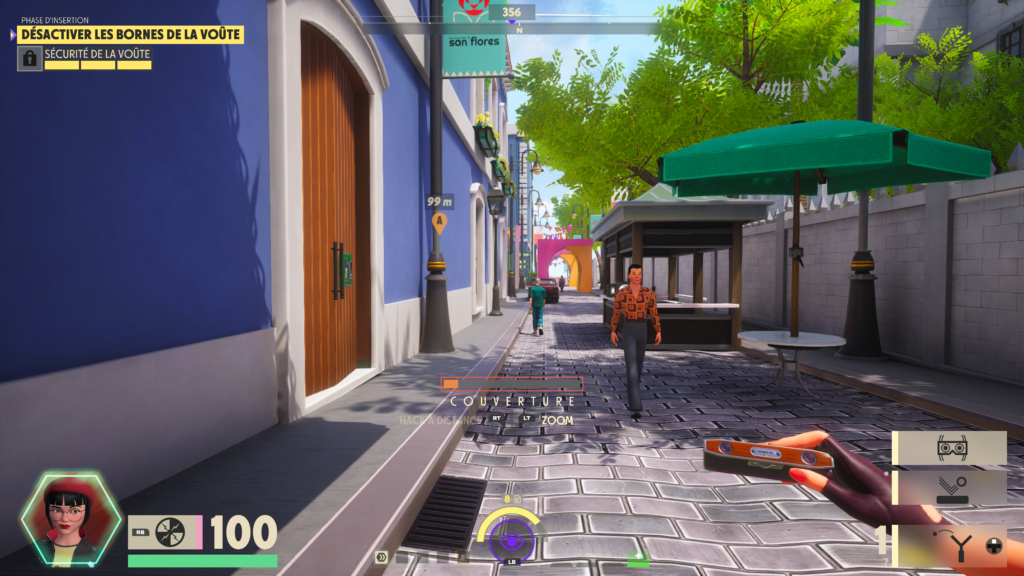 Enfin, pour encore rendre l’impression d’être une IA, vous pouvez vous fondre dans la masse avec des interactions sociales, qui permettons pour certains endroits, d’avoir de bonnes vues sur les gens que vous croisez pour les suivre sans éveiller de soupçon (en plus elles sont propres à chaque niveau de déguisement. Vous pouvez aussi vous déguiser en éléments de décor (du prop hunt) ce qui peut être pratique pour vite vous camoufler si vous vos faites poursuivre par l’IA (qui est un peu bête sur ce coup) ou encore vos ennemis (s’ils sont bêtes aussi).
