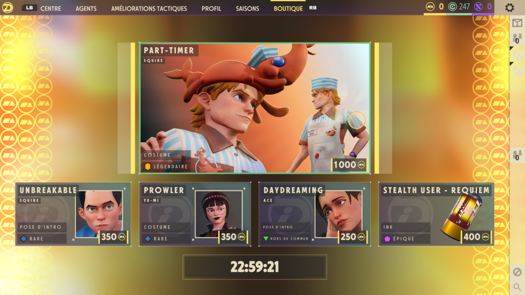 Pour tout amoureux de beauté et de strass, sachez que vos agents seront bien sûr personnalisables grâce à des skins pour eux ou encore leurs gadgets et armes, qui seront possibles de débloqués par trois choix. La première est de tout simplement de farmer les niveaux pour obtenir des caisses aléatoires qui comprendront 3 cosmétiques de rareté aléatoire. La seconde est directement de les acheter avec la monnaie du jeu (qu’on gagne avec le temps de jeu) seulement pour les cosmétiques (déjà disponible au lancement) et nouveaux agents (car oui il y en a encore 5 à débloquer mais vous avez déjà 500 crédits dès le début pour vous faire plaisir) ou avec de l’argent réel sous nom de Bonds (qui pour eux servent pour les achats de la boutique ou encore des d’un pass saison). Car oui, la dernière façon d’obtenir des nouveaux cosmétiques et qui est à la mode pour tous les jeux actuels, c’est le fameux passe de saison. Malheureusement sur cette partie je peux vous en dire plus car aucune saison n’est encore lancée je mettrais à jour en temps voulu mais devrait prendre le principe des différents pays qu’on connait sur les autres jeux.