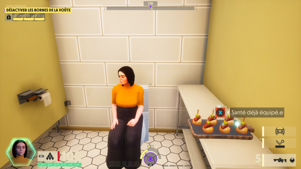 De plus lors de vos parties, vous aurez la possibilité de trouver des cartes d’accès (une pour chaque couleur d’accréditation) qui vous permettons d’emprunter les portes fermées gratuitement (on peut facilement les entendre en plus). Il y aura aussi des munitions et de la vie (sous forme de plats à manger) disséminé un peu partout sur la map. Ou sous la forme des distributeurs qu’il faudra hacker pour les utiliser. Des coffres-forts, eux aussi de couleurs sont présents pour obtenir une petite carte mémoire (que vous pouvez personnaliser en début de partie) qui permettra d’améliorer vos compétences et rendre votre progression plus rapide. Cependant pour les obtenir, il faudra débourser des points d’hack mais attention à faire ça discrètement, car les autres joueurs verront le coffre ouvert après votre passage. En plus de tout cela, et pour vous aider dans la navigation, vous pouvez utiliser le bouton LB qui vous mettra en surbrillance, les objectifs, ou encore les objets utiles et ainsi créer un chemin qui sera automatiquement le plus court pour y arriver.