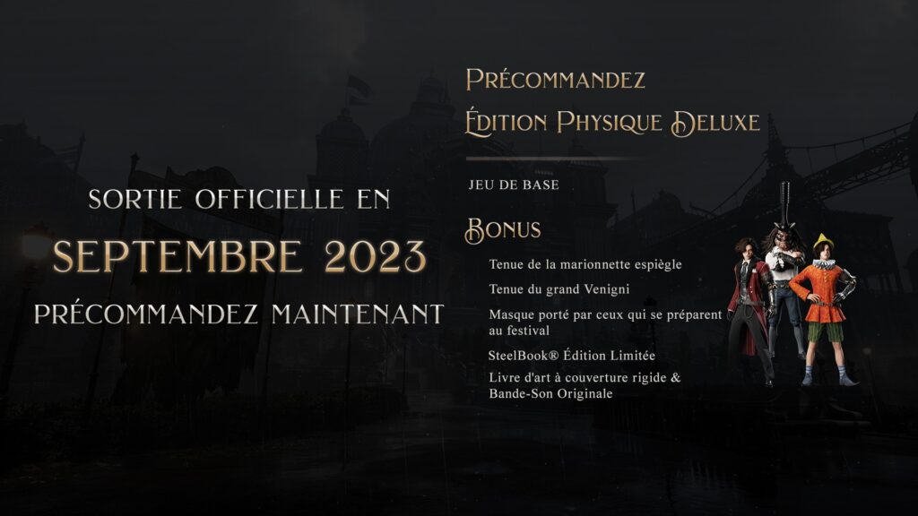 Disponible en précommande dès maintenant, l’édition Deluxe de Lies of P comprend une copie physique du jeu présentée dans une boîte collector exclusive inspirée d’un grimoire, un SteelBook en édition limitée, un artbook à couverture rigide et des éléments numériques bonus, dont la bande originale et les tenues « Ensemble du Grand Venigni » et « Masque porté par ceux qui se préparent au festival ».