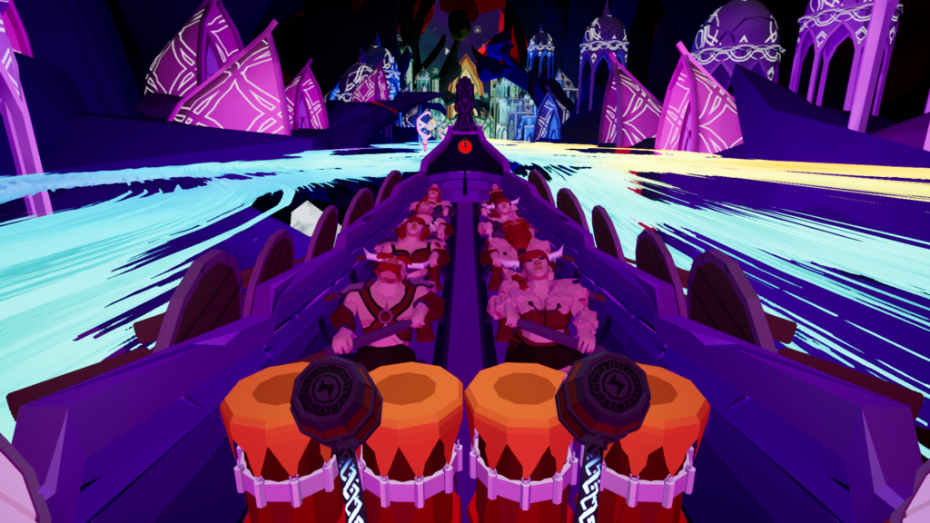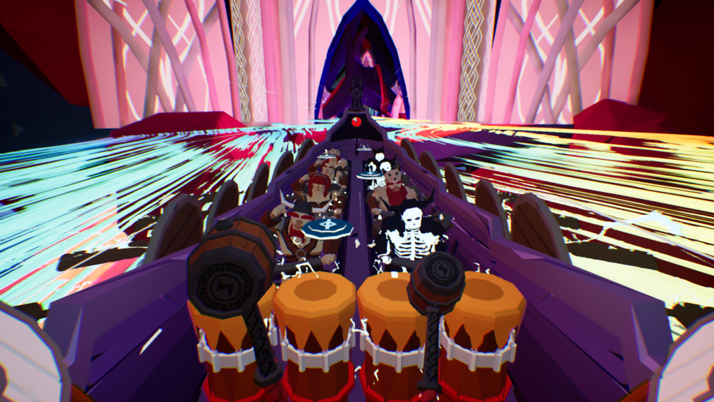 Dans Ragnarock, vous êtes le capitaine d’un drakkar (langskip) viking et avez pour but de le faire avancer le plus loin possible. Pour ce faire, il vous faudra frapper précisément et en rythme les 4 tambours devant vous à l’aide de vos deux marteaux. Voilà je vous ai résumé en quelques mots simplement le jeu. Oui, on est loin des grosses productions, ici c’est du basique.