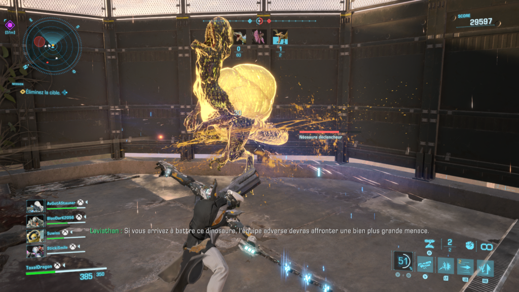 Comme vous l’avez compris, nous allons parler plus en détails du mode de jeu d’Exoprimal. Celui-ci se fera en deux phases dont la construction sera quasi identique pour chaque partie que vous entreprendrez. Les parties se jouent en 5vs5, la première phase sera du PVE et le but sera la course à l’équipe qui arrivera à terminer 5 manches le plus rapidement possible. Léviathan nous ordonnera de tuer un nombre précis de Dinosaures avant de passer à la suite. Ainsi de suite. Quand les équipes ont terminé, nous passons à la deuxième phase qui peut-être choisi dans le menu principal. PVE, PVP ou Aléatoire. Ce dernier octroi un bonus d’expérience de 1,2 en plus. Donc c’est à vous de choisir, mais même en PVE vous avez une part de PVP qui subsiste.
