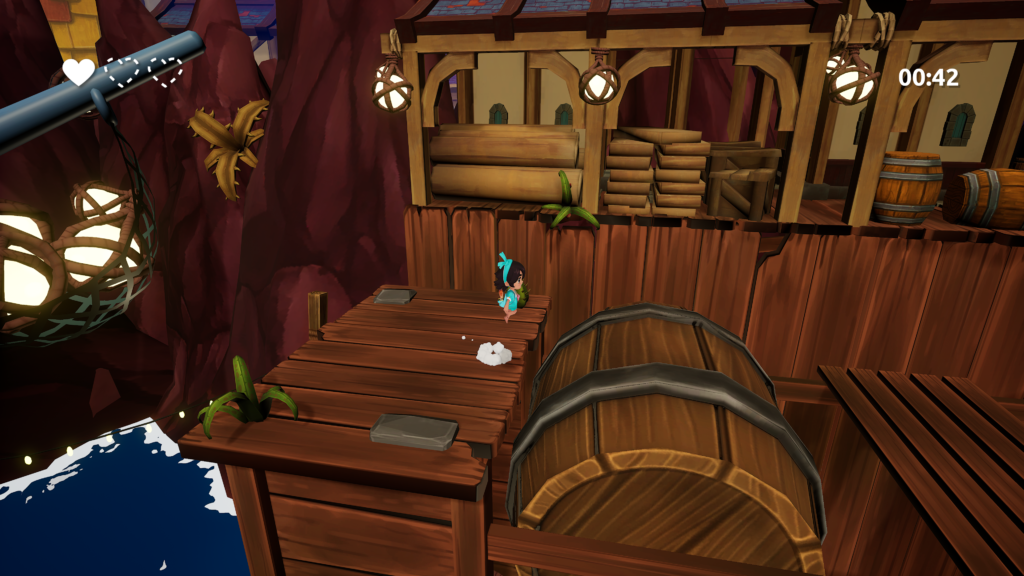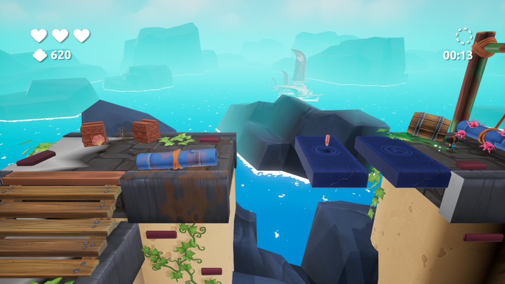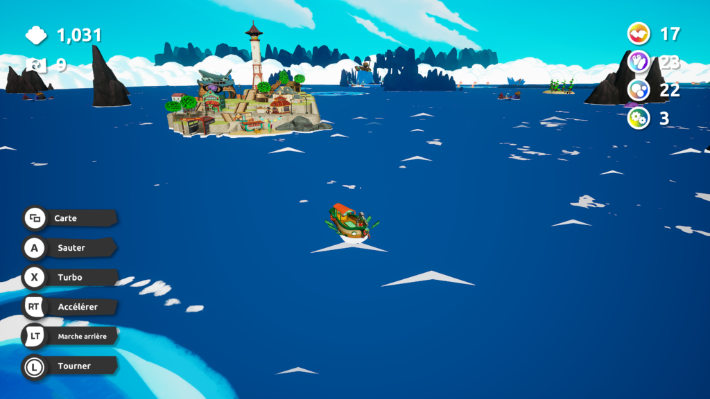 Comme tout jeu de plateforme, le titre peut être abordé de deux façons. Ici, les roulades font partie des capacités et seront fort utiles pour avancer à toute allure sur les nombreux parcours. Celui-ci permettra pour chaque niveau de remporter une médaille coquillage de vitesse lorsque le niveau est complété. Ou la seconde option, il est possible d’avancer « Piam-Piam » pour collecter tout ce que le niveau nous apporte, des pièces de coquillages mais aussi des sortes de collectibles qui permettront aux différents marchands de la ville de vous proposer de nouvelles choses et de restaurer l’île.