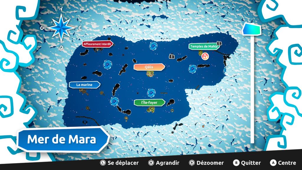 Pour faire le tour des épreuves, compter environ 4H si vous y allez doucement sans prise de tête, 6/8H pour le compléter à 100 %, une durée de vie honnête pour ce que le studio nous propose. On progressera d’île en île afin d’affronter les épreuves et de finir sur un combat de boss. Ces épreuves seront pour chaque îles différents. Tantôt des courses rythmées ou il faudra arriver en premier ou tantôt des combats traditionnels où il faudra renvoyer les bombes. tout ceci ne rend pas le titre linéaire et varie les épreuves proposées. En terminant l’épreuve, les personnages vous donneront une carte qu’il faudra décrypter à Qälis afin de lever le brouillard et passer à la suite.