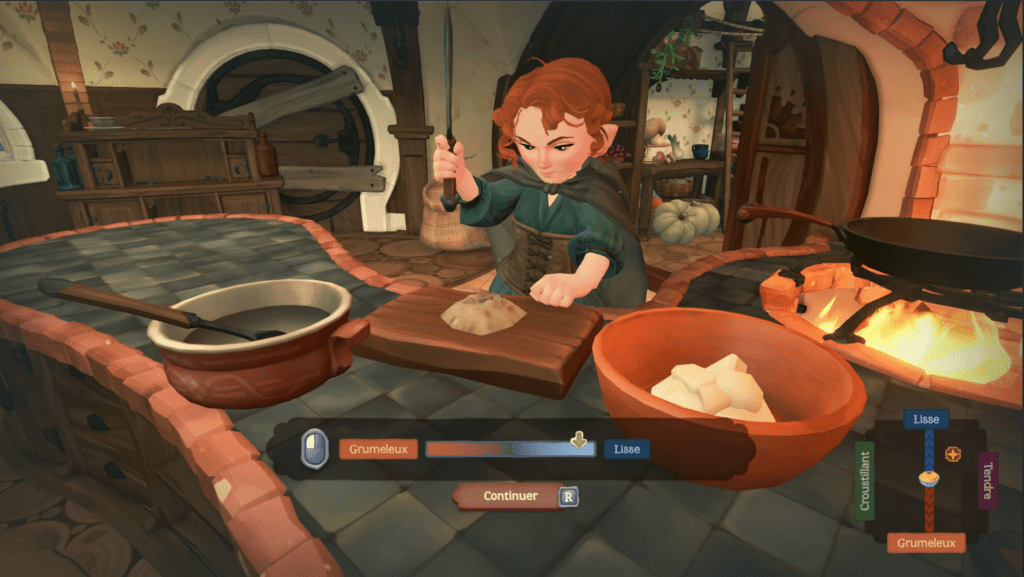 Comme vous le savez peut-être les Hobbits adore manger, et le jeu respecte ça en nous proposant un mini jeu de cuisine, plaisant. On ne doit pas uniquement assembler les ingrédients et attendre, nous devons être attentif à la texture entre Lisse, Tendre, Grumeleux, Croustillant et adapter notre préparation en fonction du plat pour que le repas soit parfait.