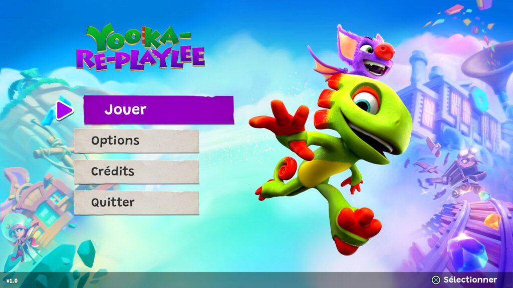 En arrière-plan, on retrouve nos chers amis Yooka et Laylee, accompagnés de quelques éléments de décors et de personnages issus du jeu. Cela donne un joli aperçu de l’univers, tout en rendant les menus vivants.