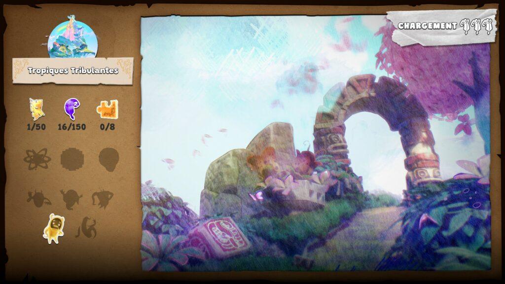 En haut à droite, le mot « Chargement » s’affiche, accompagné d’un petit effet visuel avec des plumes animées. Les temps de chargement sont relativement courts, ce qui rend l’attente peu frustrante et heureusement, ils ne sont pas très fréquents.