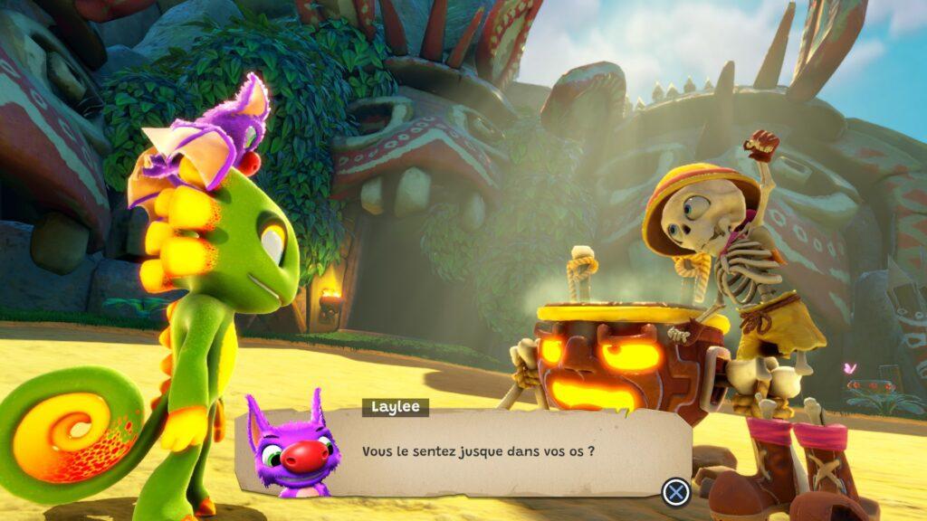 Les dialogues dans Yooka-Replaylee m’ont paru bien plus agréables que ceux de la version originale. On retrouve les fameuses bulles de texte, mais elles sont ici plus lisibles et mieux intégrées. Leur design façon parchemin légèrement abîmé est plutôt jolie