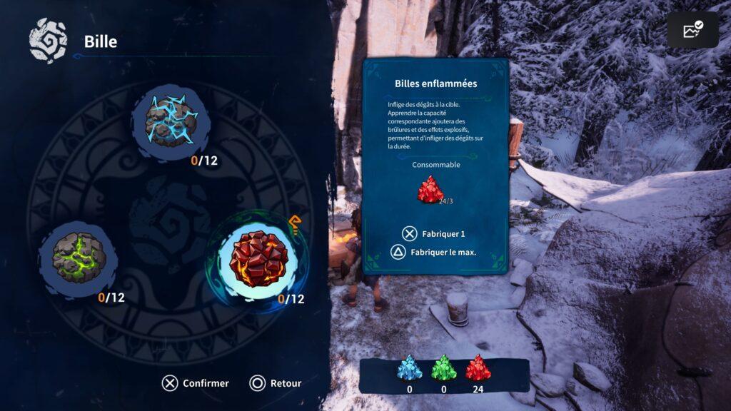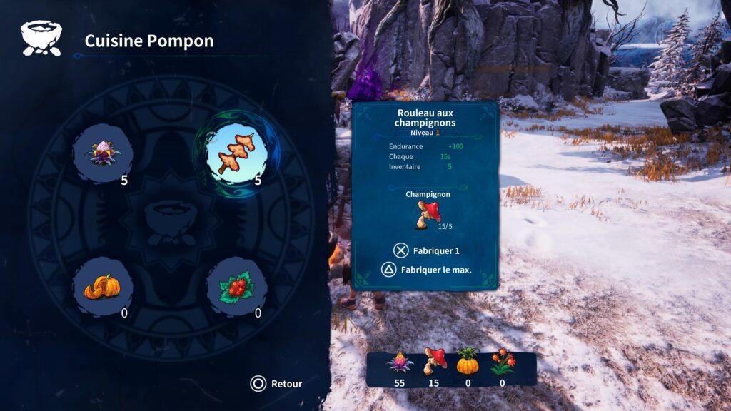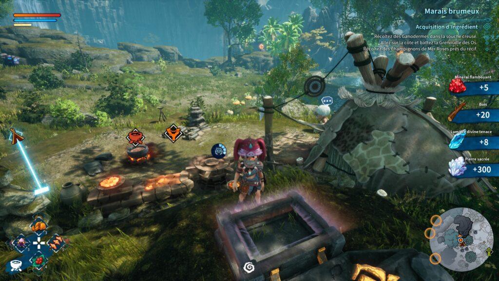 L’artisanat est agréable et accessible. Les plats nous apportent des bonus pendant un temps (très/trop) limité une fois consommés. Les pierres élémentaires quant à elles servent de munitions pour notre lance-pierre.
