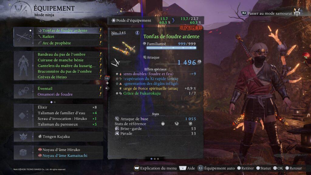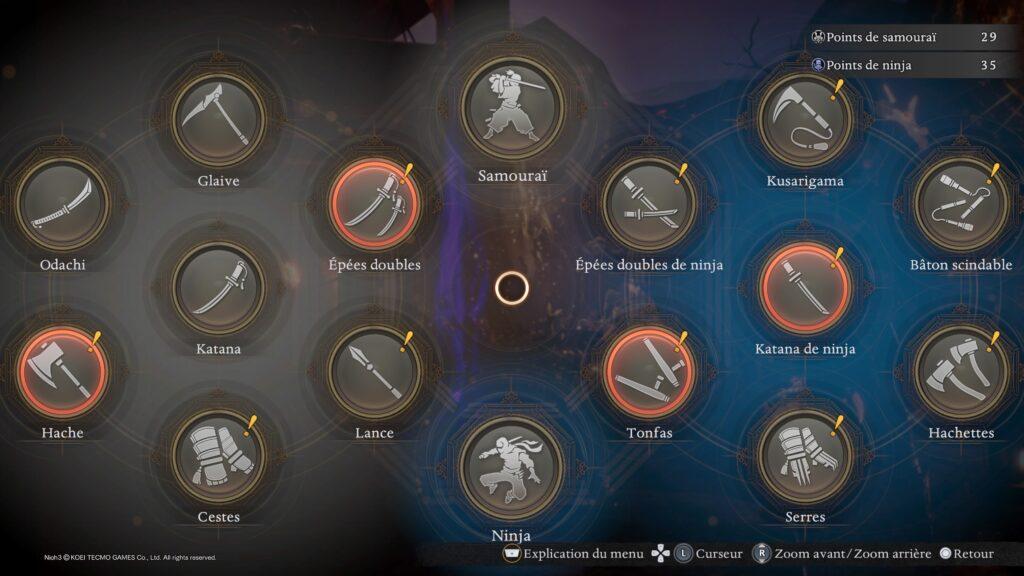 Chaque style disposera de son propre arsenal, de ces propres esprits protecteurs qui pousseront chaque joueur à créer son propre style. Même si toutefois certaines armes sont clairement surpuissantes (comme les tonfas). Entre un totale de 22 esprits protecteurs et 14 armes différentes chaque joueur trouvera forcément son style de jeu allant du bourrin avec des armes lourdes ou à l’opportuniste qui profitera de chaque esquive. De plus, les outils ninja et les parchemin de magie omnyo vous permettront de devenir maître du champ de bataille et vous en aurez bien besoin.